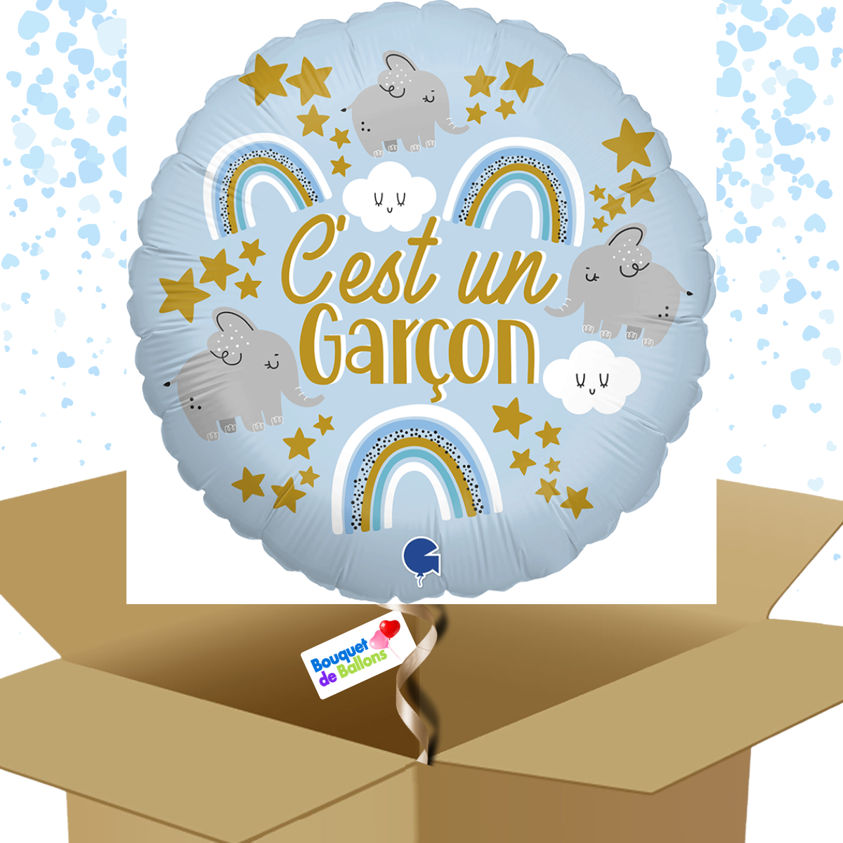 – Ballon rond bleu « C’est un GARÇON » avec motifs nuages, éléphants, et arc-en-ciel 46 cm env. gonflé à l’hélium