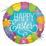 – Ballon rond blanc « Happy Easter » œufs de Paques colorés 46 cm env. gonflé à l’hélium