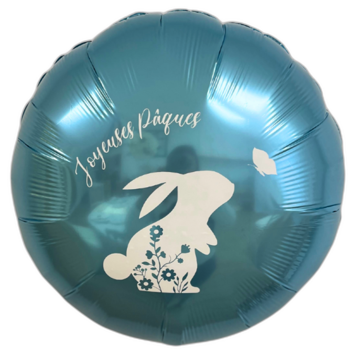 Ce ballon rond, chatoyant d’un bleu doux, est rehaussé d’une élégante silhouette de lapin de Pâques en blanc, entourée de motifs floraux délicats.